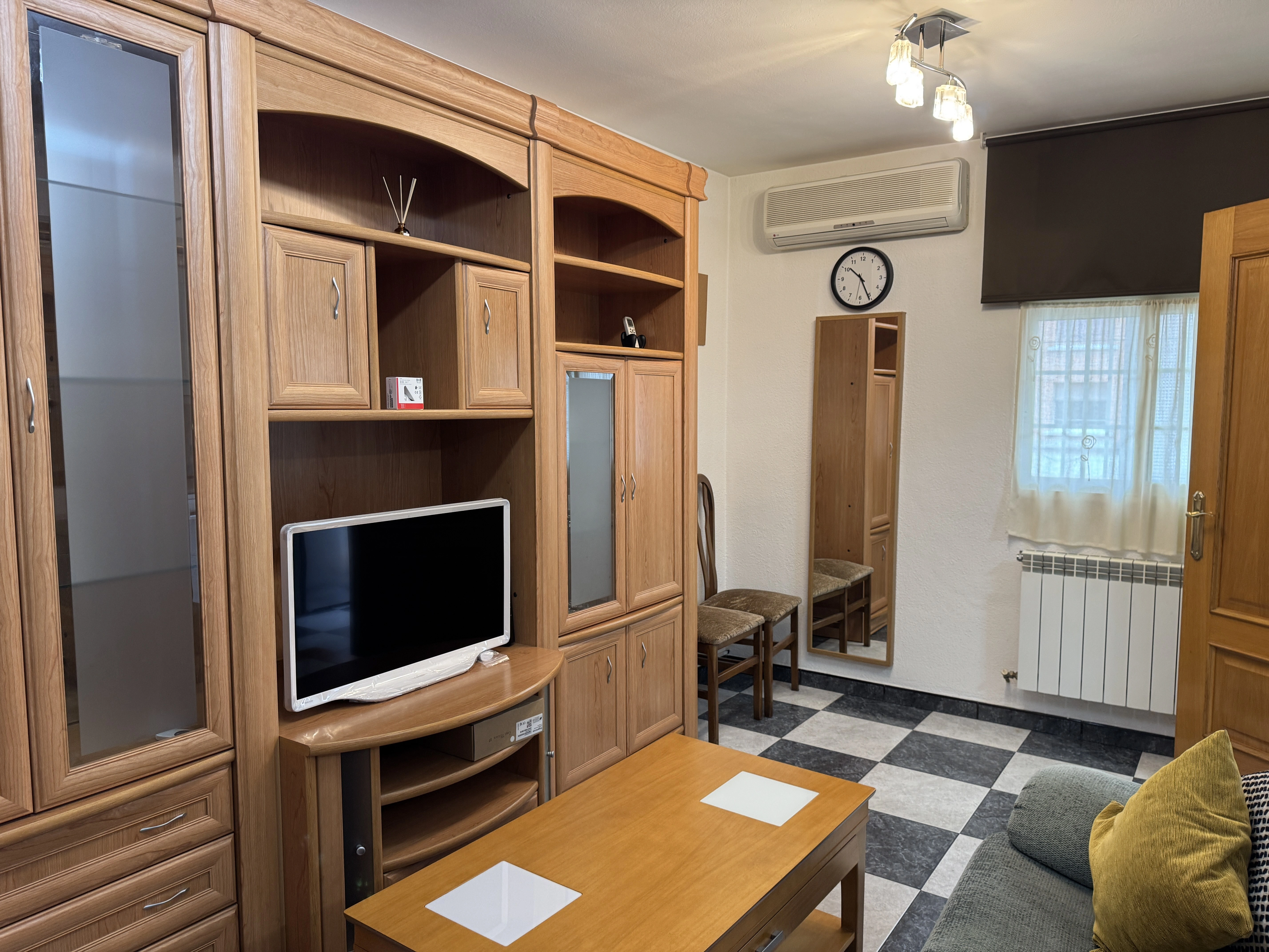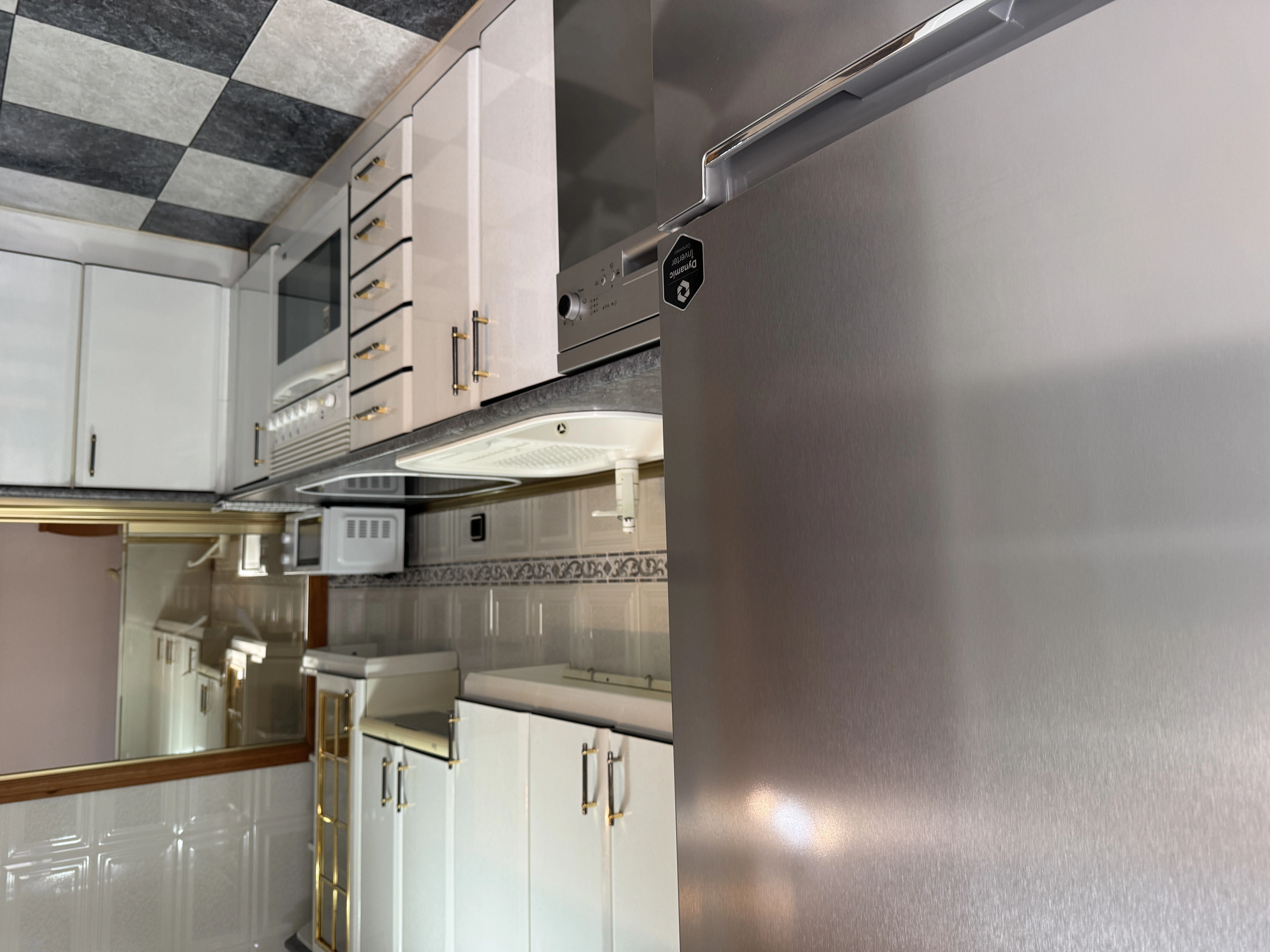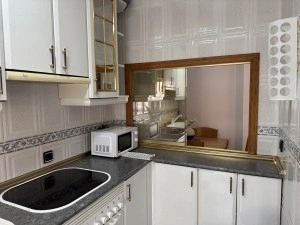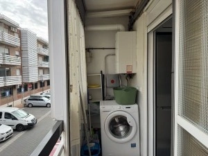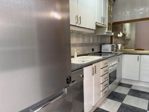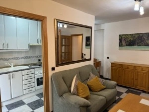 El salón es un espacio cómodo para el día a día, y la cocina independiente está totalmente equipada con nevera, lavavajillas, horno y microondas, ofreciendo todo lo necesario. Desde la cocina se accede a un balcón, donde se encuentra la lavadora, aportando funcionalidad adicional.