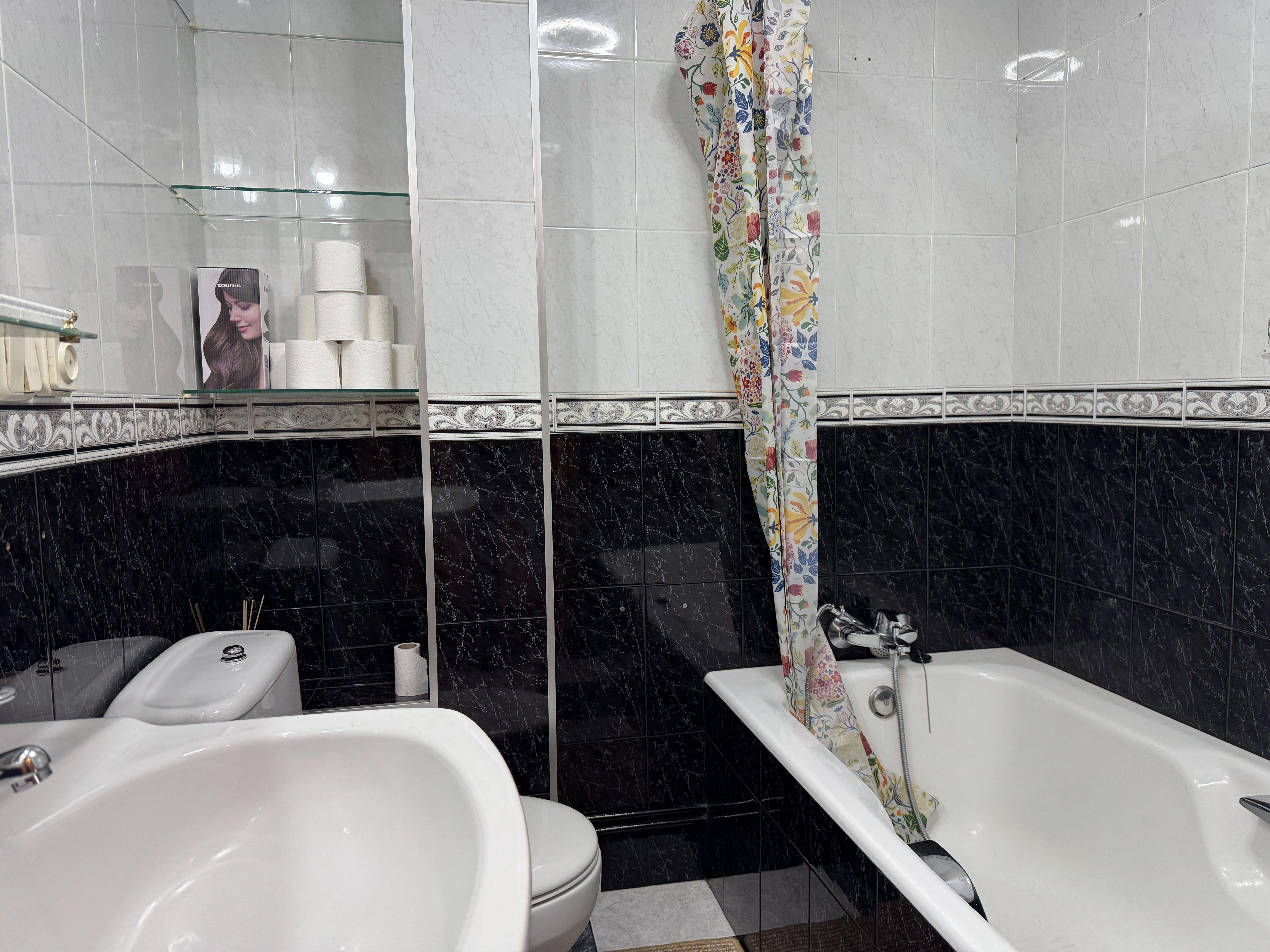 El baño está equipado con inodoro, lavabo y bañera, cubriendo las necesidades diarias de forma cómoda.